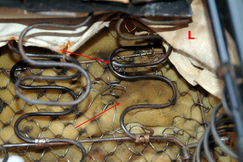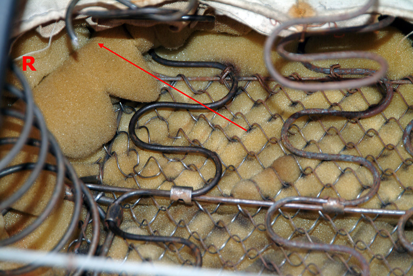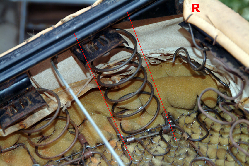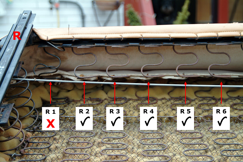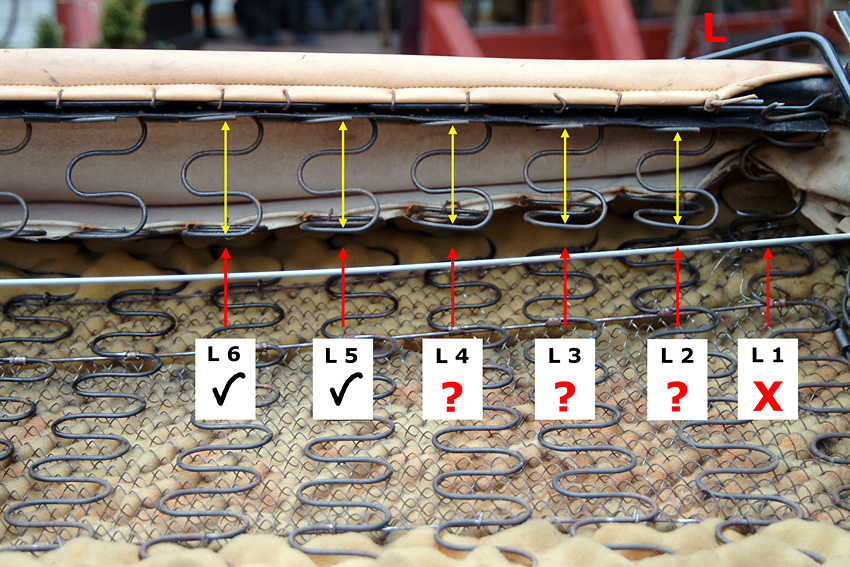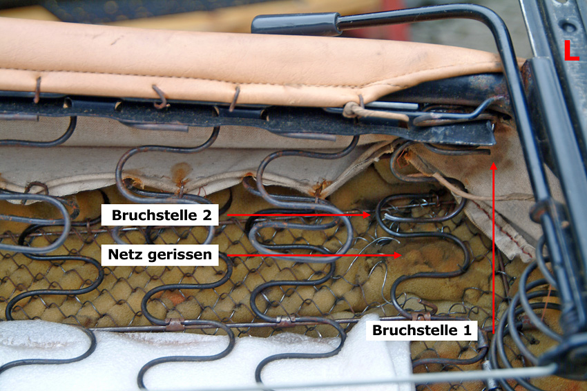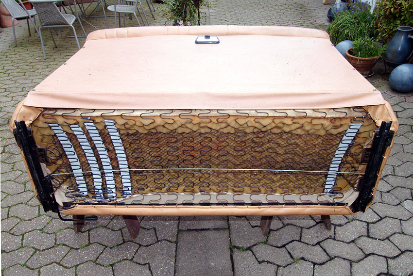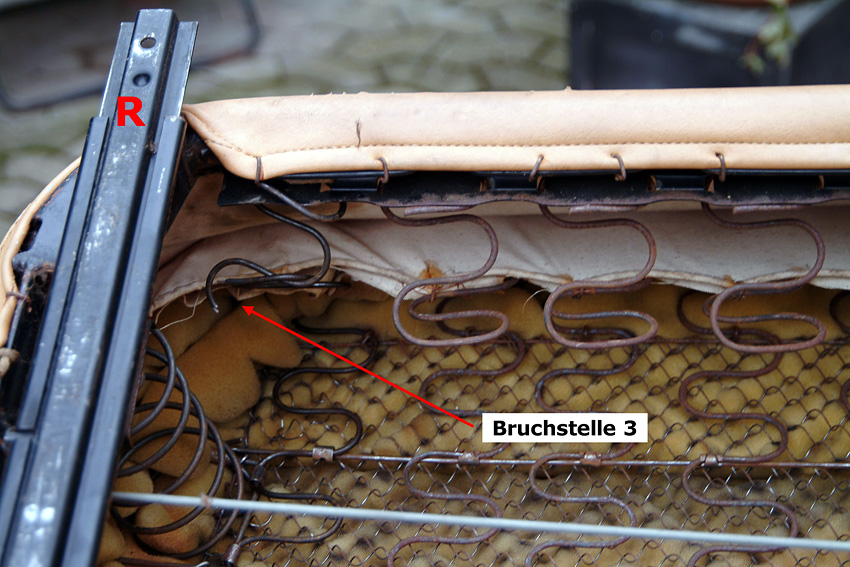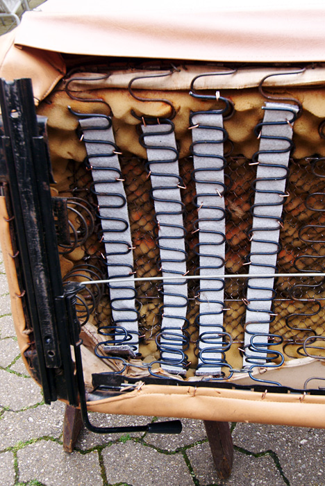Inzwischen aber ist eine weitere der Nosag-Federn gebrochen und ein paar haben deutlich an Form verloren. Es muss also jetzt etwas getan werden. Florian hat mir das Sitzkissen eines alten Einzelsitzes überlassen, aus dem ich die entsprechenden Federn entnehmen und damit in meiner Sitzbank die defekten ersetzen kann.