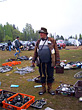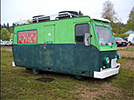 Hier das Bild eines Ausstellers in der typischen finnischen Samstags-Tracht. Man beachte die raffinierte Lüftung seiner Stiefel sowie rechts sein geniales und aerodynamisch ausgefeiltes Wohnmobil und ganz rechts sein Kurzstrecken-fahrzeug.