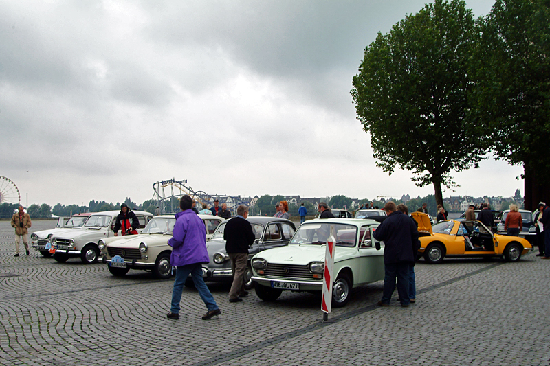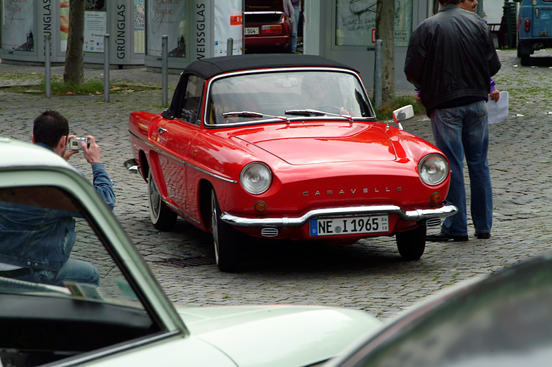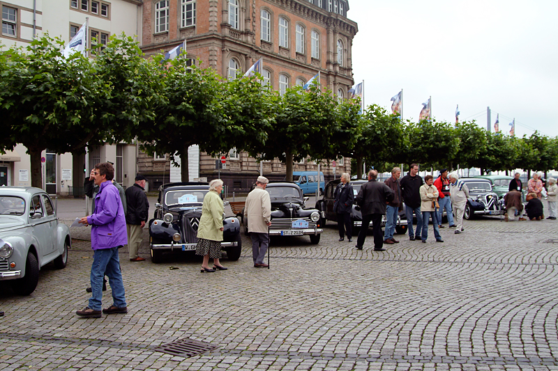 Am Samstag Vormittag sammelten sich die Teilnehmer mit ihren Autos auf dem Burgplatz in der Düsseldorfer Altstadt. Von dort starteten sie zur großen Tour durch die niederrheinische Landschaft. Aus den Erfahrungen der letzten Jahre hatte man gelernt :