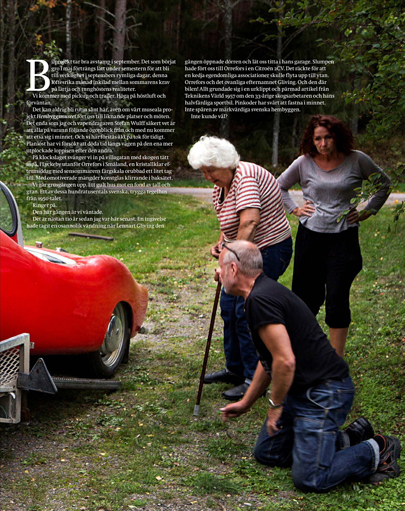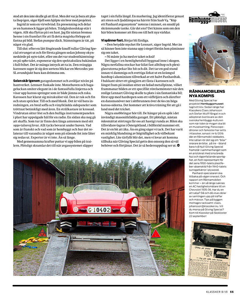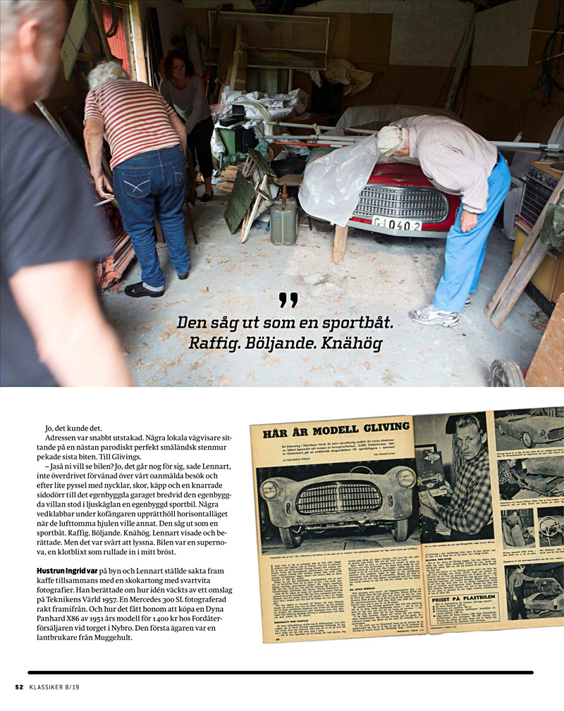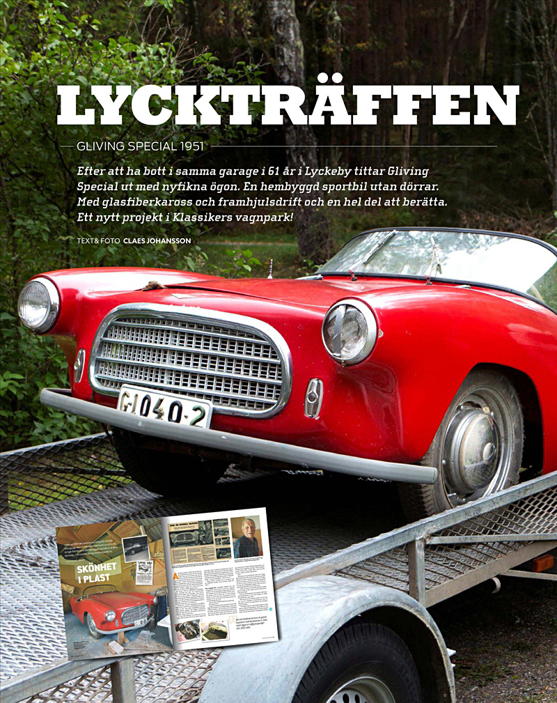 Mit Gliving Special hat das Projekt Hembyggsmuseet einen Schritt nach vorne gemacht. Die Klassizisten Claes Johansson und Stefan Wulff haben schon seit langem Überbleibsel der schwedischen Hausbaukultur eingefangen und übernommen, die zu gegebener Zeit zu einer Museumssammlung werden sollen. Mehrere Expeditionen und Fahrzeuge sind in Klassiker zu sehen gewesen, zuletzt in Ausgabe 6/2016, wo ein Rånnamobil gerettet wurde. Nicht selten handelt es sich dabei nicht um Automobile, sondern um "Autos", ontre-ibland nur um zwei Räder! Der Gliving Special sticht in diesem Zusammenhang als Aristokrat mit seinen breiten Rädern und seiner auffälligen Sportlichkeit hervor, ein edler Vertreter des Plastikfiebers der späten 1950er Jahre im Gegensatz zu den Sperrholz-Surrogat-Wagen der 1940er Jahre.