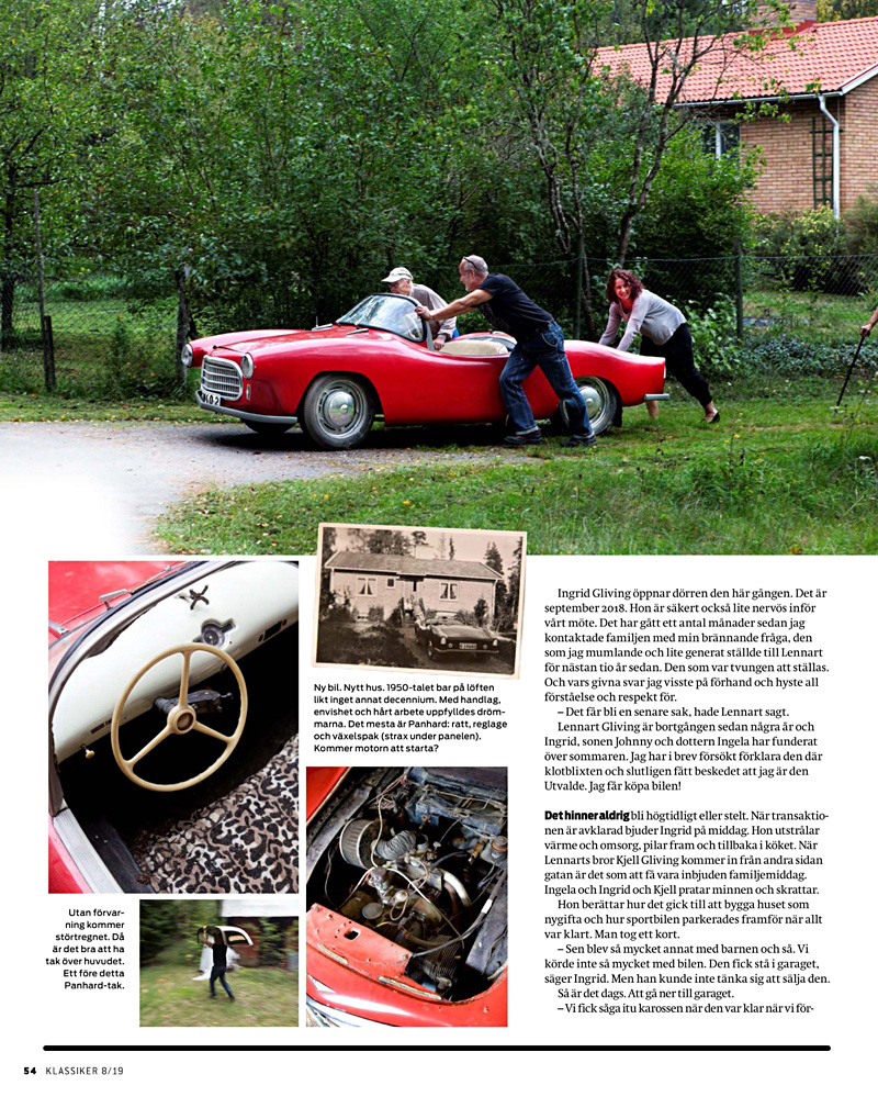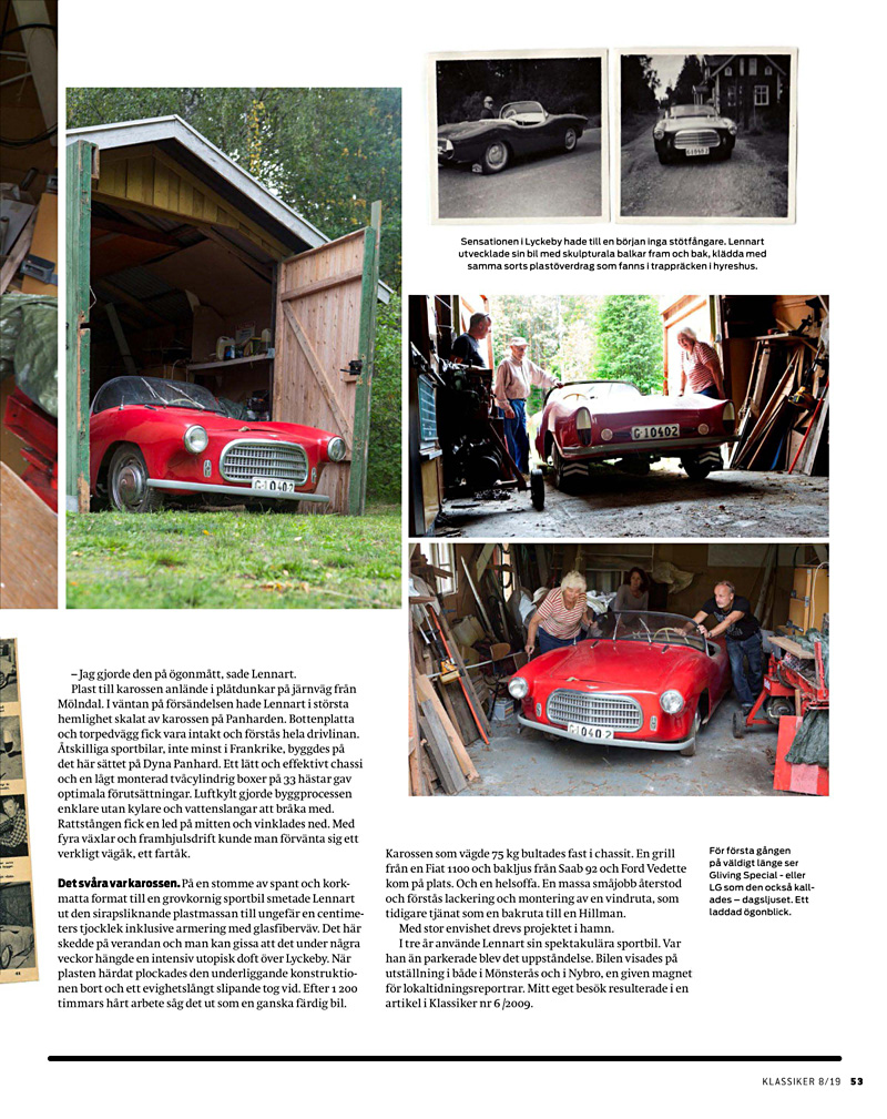Mit großer Beharrlichkeit wurde das Projekt abgeschlossen. Drei Jahre lang nutzte Lennart seinen spektakulären Sportwagen. Wo immer er geparkt hat, gab es einen Aufruhr. Das Auto wurde sowohl in Mönsterås als auch in Nybro ausgestellt, ein gegebener Magnet für die Reporter der lokalen Zeitungen. Mein eigener Besuch führte zu einem Artikel in Klassiker Nr. 6/2009.
